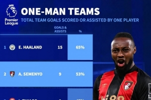 體育資訊11月18日訊 德國轉(zhuǎn)會市場統(tǒng)計了球員本賽季英超參與進球數(shù)量占據(jù)球隊總進球的比例,并列出榜單,哈蘭德占比65%最高,塞梅尼奧占比53%第二。