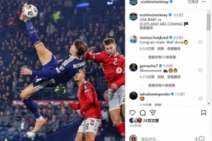 麥克托米奈社媒慶祝球隊進入世界杯,配文:“美國寶貝,蘇格蘭來了!”