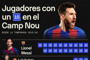 體育資訊11月22日訊 巴薩即將重返諾坎普,Sofascore統(tǒng)計(jì)了2015-2016賽季以來球員在諾坎普球場比賽中獲評10分的場次,并列出榜單,梅西19場居首。