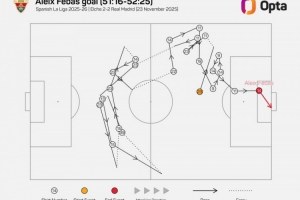 數(shù)據(jù)統(tǒng)計顯示,這粒進球經(jīng)歷了22腳傳遞,是本賽季西甲第二多。