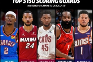 五人分別是:1、亞歷山大(每個(gè)單打回合得分 1.28分);2、鮑威爾 1.25分;3、米切爾 1.24分;4、哈登 1.12分;5、布克 1.11分。