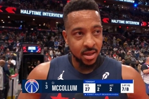 上半場,奇才后衛(wèi)麥科勒姆手感滾燙,打了18分鐘13投10中,三分8中7狂砍27分2籃板2助攻1搶斷,正負值+22。