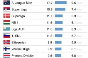 U21球員出場(chǎng)時(shí)間占比17.7%的澳超聯(lián)賽,在本次排名中位居首位。塞爾維亞超級(jí)聯(lián)賽(15.8%)和丹麥超級(jí)聯(lián)賽(11.7%)緊隨其后,排名二三位。
