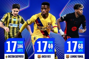 歐冠官方曬出最年輕進(jìn)球者前三海報,其中法蒂以17零40天成為歐冠最年輕進(jìn)球者,其次是17歲零68天的亞馬爾,排名第三正是薩特帕耶夫。