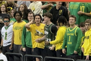 今日俄勒岡大學(xué)以67-63戰(zhàn)勝萊斯大學(xué),取得開季兩連勝,小吧來到現(xiàn)場(chǎng)觀戰(zhàn),看到現(xiàn)場(chǎng)有很多林葳的球迷,一個(gè)外國(guó)人還穿著同曦球衣。