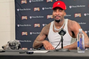 賽后德拉蒙德帶著愛犬出席了球隊的新聞發(fā)布會,并打趣道:“嘿我哥們兒來啦(My dog's here),是真的狗狗(my actual dog)?!?/p>