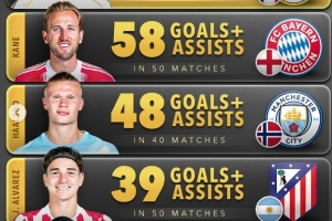 體育資訊11月10日訊 數(shù)據(jù)網(wǎng)站Score90盤點(diǎn)了2025年五大聯(lián)賽前鋒球員,在各項(xiàng)賽事參與進(jìn)球榜,其中姆巴佩62球居首,以下為具體情況(進(jìn)球+助攻):