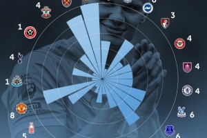 體育資訊12月3日訊 哈蘭德達(dá)成英超百球里程碑,英超官方也曬出哈蘭德百球攻破球門對(duì)手分布,具體如下: