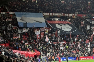 在死忠看臺(tái),一眾曼聯(lián)球迷打出大幅tifo表達(dá)對(duì)利馬的支持,將阿根廷國(guó)旗里的太陽(yáng)替換為了菜刀…