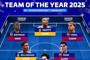 體育資訊12月8日訊 德轉(zhuǎn)列出經(jīng)投票選出的2025年度最佳陣,姆巴佩、亞馬爾、貝林厄姆、佩德里在列。