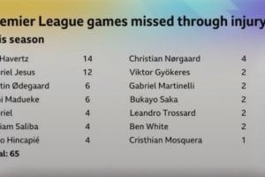 BBC統(tǒng)計(jì)阿森納本賽季截止目前的傷病,因傷導(dǎo)致的球員缺戰(zhàn)英超總場次數(shù)已達(dá)到65場。