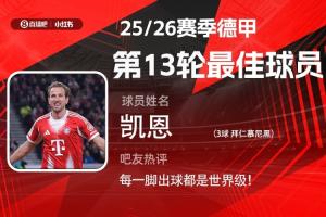第13輪評選結(jié)果結(jié)出爐,凱恩替補(bǔ)登場30分鐘上演帽子戲法,助拜仁大勝斯圖加特,獲得吧友超2.7萬票支持,當(dāng)選【體育資訊X小紅書德甲第13輪最佳球員】!