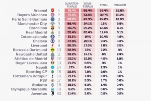 opta本賽季歐冠奪冠概率:阿森納22.6%居首,拜仁巴黎二三位