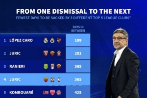 本世紀(jì)五大聯(lián)賽教練最短時(shí)間被三家俱樂部解雇排名: