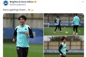 布萊頓社媒曬出三笘薫的照片,確認這位日本攻擊手恢復(fù)訓練,配文:“三笘薫距離復(fù)出更近了?!?/p>