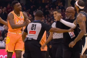 GIF-布萊恩特?fù)跞藭r(shí)推倒特倫特引發(fā)沖突