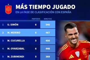 體育資訊11月19日訊 德國(guó)轉(zhuǎn)會(huì)市場(chǎng)統(tǒng)計(jì)了西班牙球員本屆世預(yù)賽的出場(chǎng)時(shí)間,并列出榜單,門將西蒙540分鐘居首,梅里諾467分鐘非門將球員中最多。
