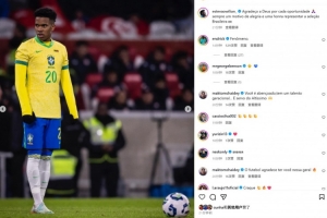 埃斯特旺也在社媒曬出本場(chǎng)照片,配文寫(xiě)道:“為每一次機(jī)會(huì)感謝上帝,能夠代表巴西國(guó)家隊(duì)出戰(zhàn)一直是一份榮譽(yù)!”