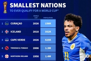 體育資訊11月20日訊 世預(yù)賽當(dāng)前僅剩多個附加賽名額待定,庫拉索以15.6萬人成為二戰(zhàn)之后晉級世界杯的人口最少國家,《轉(zhuǎn)會市場》也統(tǒng)計了二戰(zhàn)之后晉級世界杯人口最少的國家前十。