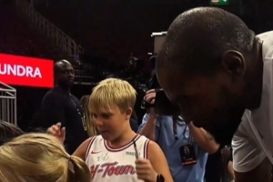 GIF-杜蘭特賽前為小球迷簽名