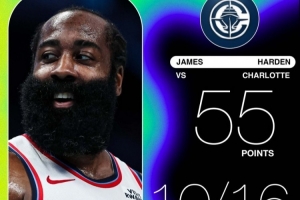全場(chǎng)比賽,快船球星哈登出戰(zhàn)35分鐘,26中17,三分16中10得到55分3板7助攻1搶斷。