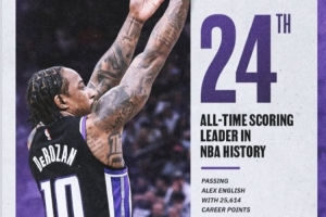 此役過(guò)后,德羅贊生涯總得分來(lái)到了25629分,超越了英格利什,來(lái)到NBA歷史第24位,將追趕卡特(25728)。