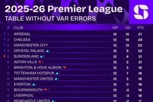 體育資訊11月26日訊 數(shù)據(jù)網(wǎng)站Squawka票選了本賽季英超每周最具爭議的VAR判罰,并列出了若無VAR誤判的英超積分榜。