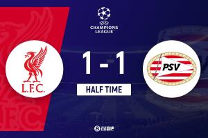 上半場傷停補時1分鐘,半場結(jié)束,利物浦暫1-1埃因霍溫。