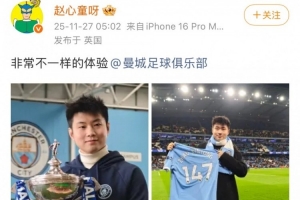 趙心童在社媒寫道:“非常不一樣的體驗。@曼城足球俱樂部”