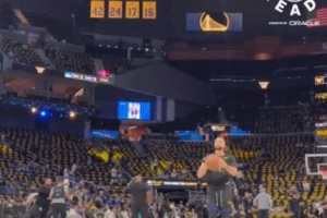 賽前熱身環(huán)節(jié),庫里秀了一把空接背扣,落地后還原地轉(zhuǎn)身耍帥,心情不錯。