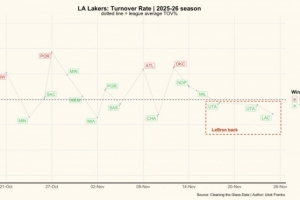備注:虛線(xiàn)為聯(lián)盟平均線(xiàn),綠色為贏(yíng)球比賽失誤率,紅色為輸球比賽失誤率