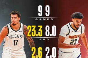 小波特前九場(chǎng):場(chǎng)均23.3分7.6籃板2.6助攻,命中率47.2%