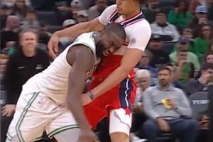 發(fā)際線粉事件之一:對(duì)陣奇才時(shí)杰倫·布朗發(fā)際線粉粘到對(duì)手白T上
