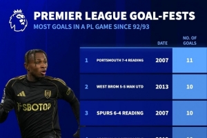 體育資訊12月3日訊 英超第14輪比賽,曼城客場5-4擊敗富勒姆。德國轉(zhuǎn)會市場指出,英超歷史上只有6場比賽的進(jìn)球數(shù)量多于此役。