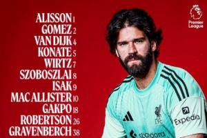 利物浦首發(fā):1-阿利松、2-戈麥斯、4-范戴克、5-科納特、26-羅伯遜、7-維爾茨、8-索博斯洛伊、10-麥卡利斯特、38-赫拉芬貝赫、9-伊薩克、18-加克波