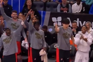 首節(jié)比賽,開拓者中鋒羅伯特·威廉姆斯飚中生涯第二記三分,楊瀚森與替補席的隊友們開心慶祝。