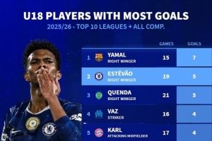 體育資訊12月6日訊 德國轉(zhuǎn)會市場統(tǒng)計了本賽季前十聯(lián)賽U18球員的進球數(shù)量,并列出榜單,亞馬爾7球居首,埃斯特旺5球并列次席。