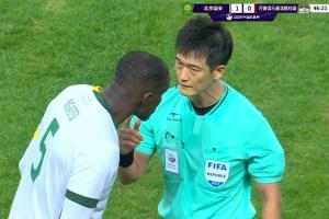 執(zhí)法本場比賽的韓國裁判高亨進半場出示了三張黃牌,回看VAR改判點球。