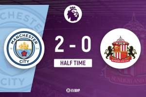 傷停補時3分鐘。上半場比賽結(jié)束,曼城2-0桑德蘭。