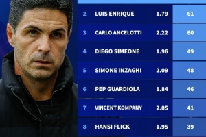體育資訊12月11日訊 在本輪歐冠,阿森納3-0大勝布魯日,豪取6連勝。德轉(zhuǎn)也盤點(diǎn)了自阿爾特塔執(zhí)教阿森納歐冠首秀以來,各位主帥在歐冠同期積分榜(包括淘汰賽),具體如下(場均積分+總積分):