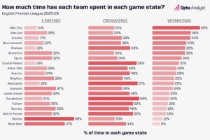 本賽季英超平均每場(chǎng)領(lǐng)先時(shí)間:曼市雙雄、阿森納前3,利物浦第13