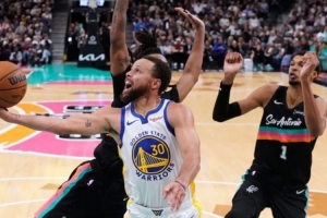 上半場卡斯?fàn)柌煌9魩炖?,庫里還以內(nèi)切,15分。下半場開始,馬刺路徑依賴,瓦塞爾和巴恩斯追打庫里,但庫里做了個(gè)動搖馬刺根本的事: