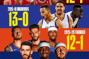 開賽13場(chǎng)后,雷霆以12勝1負(fù)的戰(zhàn)績(jī)追平了96公牛的同期紀(jì)錄,在杰倫·威廉姆斯因手腕傷勢(shì)持續(xù)缺陣的情況下,雷霆在13場(chǎng)比賽中凈勝對(duì)手202分,場(chǎng)均凈勝分高達(dá)驚人的15.5分。