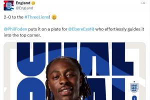 英格蘭官方在播報(bào)進(jìn)球時(shí)寫道:“三獅軍團(tuán)2-0領(lǐng)先!福登將球喂到嘴邊,埃澤毫不費(fèi)力地將球送入上角?!?/p>