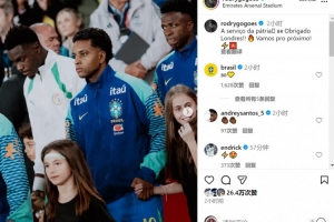 此役羅德里戈為巴西隊(duì)首發(fā)出戰(zhàn),定位球助攻卡塞米羅破門,賽后羅德里戈社媒曬照慶祝勝利,配文:“為國出戰(zhàn),感謝倫敦!專注于下一場比賽!”